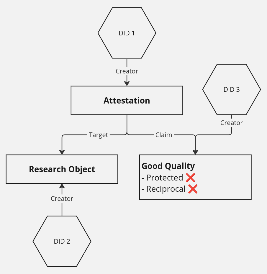 <figure><img src="https://173088917-files.gitbook.io/~/files/v0/b/gitbook-x-prod.appspot.com/o/spaces%2FuLEzUfpuZ1EbnvdhdDi9%2Fuploads%2Fgit-blob-98a5dd2eb9468c30c4a1393fe87fcdff2662d591%2Fimage.png?alt=media" alt=""><figcaption><p>Valid attestation pattern for a claim that is <strong>non-protected</strong> and <strong>non-reciprocal,</strong> essentially without constraints.<br>The claim and the attestation can be made by different actors, and the creator of the target does not need to consent.</p></figcaption></figure>