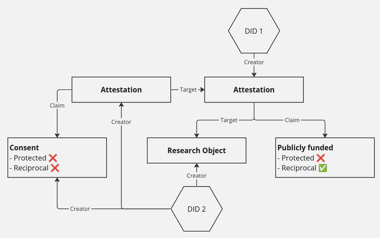 <figure><img src="https://173088917-files.gitbook.io/~/files/v0/b/gitbook-x-prod.appspot.com/o/spaces%2FuLEzUfpuZ1EbnvdhdDi9%2Fuploads%2Fgit-blob-b121a3610dfb586246d9ef2cc2ac1a298879042d%2Fimage.png?alt=media" alt=""><figcaption><p>Valid attestation pattern for a claim that is both <strong>protected</strong> and <strong>reciprocal</strong>. Note that the attester is the creator of the claim, and in addition, the creator of the target has mirrored the attestation.</p></figcaption></figure>