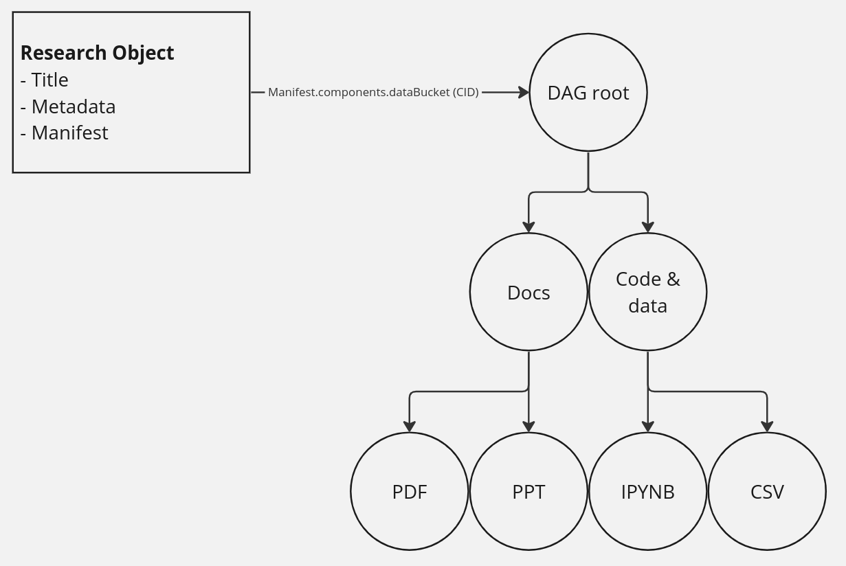 The main purpose of a research object is to keep a reference to a tree of arbitrary data. This can be thought of as a hierarchy of files just like in your personal cloud storage, but publicly available on IPFS. In the ideal case, this tree would contain a research paper, presentations, code, and the data necessary to explain and reproduce the claims of the publication.